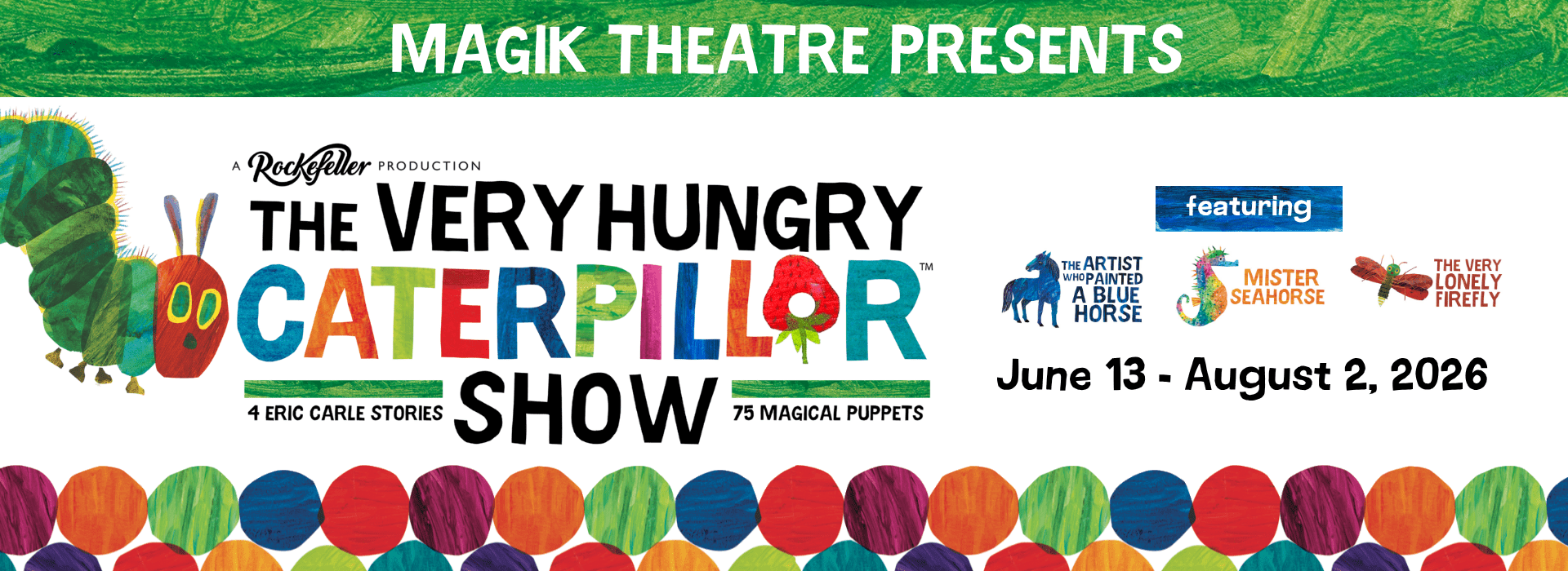 The critically acclaimed production of The Very Hungry Caterpillar Show created by Jonathan Rockefeller features a menagerie of 75 lovable puppets. The production faithfully adapts four stories by author/illustrator Eric Carle: The Artist Who Painted a Blue Horse, Mister Seahorse, The Very Lonely Firefly and of course, the star of the show – The Very Hungry Caterpillar. The Very Hungry Caterpillar has delighted generations of readers since it was first published in 1969 selling more than 48 million copies worldwide.